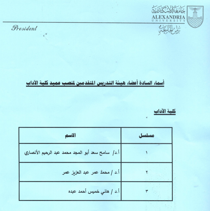 أعلنت جامعة الاسكندرية أسماء السادة أعضاء هيئة التدريس المتقدمين لمنصب العميد بكلية الآداب والتي جاءت على النحو التالي: