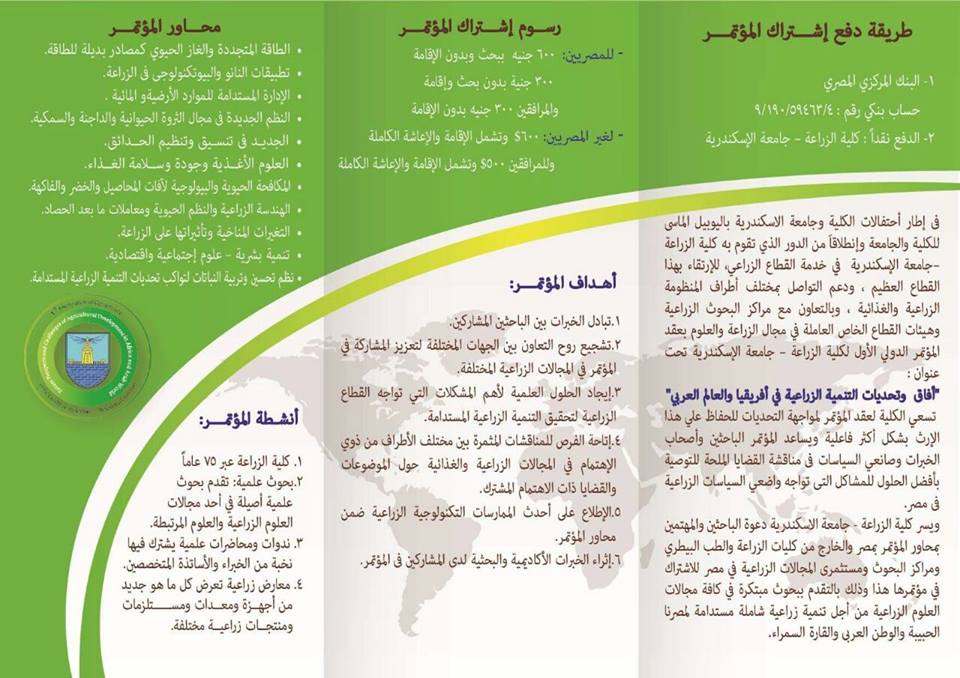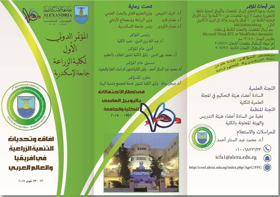 تنظم كلية الزراعة جامعة الاسكندرية يومي 22 و23 فبراير 2017، المؤتمر الدولي الأول للكلية تحت عنوان "افاق وتحديات التنمية الزراعية في افريقيا والعالم العربي"