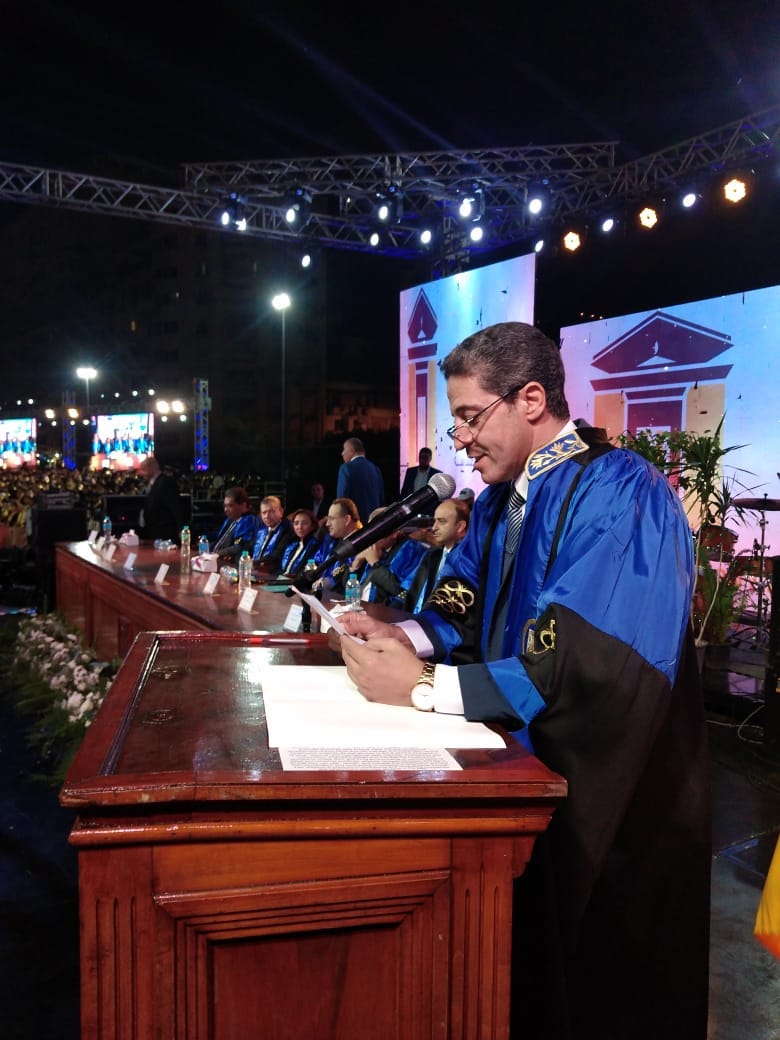 وفي بداية كلمته وجه الدكتور عبد العزيز قنصوه التهنئة للحضور بمناسبة الذكرى الـ ٥٠ لنصر أكتوبر المجيد، ووجه التحية لأولياء أمور الطلاب شاكراً إياهم على جهدهم تجاه أبنائهم من أجل الوصول لهذا اليوم العظيم، وأشار د. قنصوة إلي لقاء رئيس الجمهورية السيد الرئيس عبد الفتاح السيسي يوم الثلاثاء الماضي مع المجلس الأعلي للجامعات، مشيراً إلى حرص سيادته على تطوير المنظومة التعليمية ورفع تنافسية الخريجين، ولفت أن جامعة الإسكندرية تعمل وفق إستراتيجية الدولة المصرية في تطوير التعليم من خلال عقد الشراكات مع كبرى الجامعات العالمية، وأعلن أن عدد إتفاقيات التعاون الدرجات المشتركة التي وقعتها جامعة الإسكندرية مع الجامعات العالمية تجاوز الـ ٥٠ درجة عملية، وأوضح أن جامعة الإسكندرية تسعى صوب العالمية من خلال إنشاء الفرع الدولي لها بالشراكة مع كبرى الجامعات العالمية، وجامعة الإسكندرية الأهلية التي تتضمن برامج دراسية جديدة ومتميزة، بالإضافة إلى افتتاح عدد من فروع الجامعات الدولية التي ستتواجد داخل جامعة الإسكندرية، وأشار ان هذا العام يعد عام التحديث لأجهزة المعامل لمرحلة البكالوريوس بالجامعة ومعامل كلية الهندسة، حيث سيتم تحديث المعامل في كليات القطاع الطبي والعلمي والتكنولوجي ومعامل اللغات والكمبيوتر لقطاع العلوم الإنسانية، وأكد أن الجامعة ستولي اهتماما خاصا بتطوير منظومة البحث العلمي القابل للتطبيق وربطه بال technology park وذلك تزامناً مع بناء الجمهورية الجديدة، حيث لن يقتصر دور البحث العلمي على النشر فحسب ولكن للتطبيق وقيام الشركات الناشئة اعتماداً علي المخرجات كنموذج لإقتصاد المعرفة، وفي ختام كلمته قدم قنصوة النصيحة للطلاب بضرورة وضع مصر نصب أعينهم لأنهم أصبحوا جزءا من مستقبلها الواعد.
